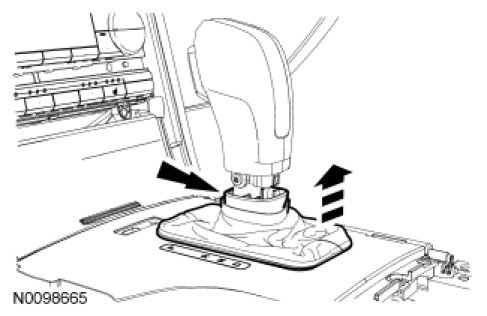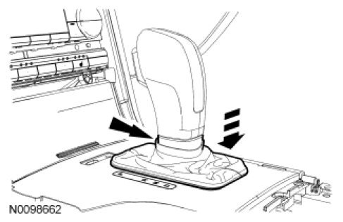2. NOTICE: When installing the selector lever boot, be sure it is in the correct position or the selector lever boot can not be installed on the selector lever knob. If needed, align the selector lever knob to the selector lever boot when installing the boot.