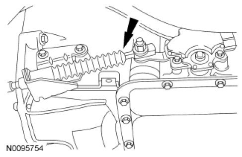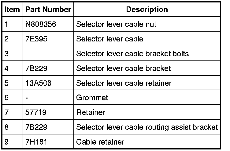 10. NOTE: When installing the selector lever cable, make sure that the selector lever cable locking tabs are locked in place and the selector lever cable end is snapped onto the ball stud. Press the selector lever cable into the bracket and listen for the selector lever cable to click in place. Pull back on the selector lever cable to make sure that it is locked into the bracket. Also make sure that the selector lever cable end is correctly installed onto the ball stud. Pull back on the selector lever cable end to make sure that the selector lever cable end is correctly installed.