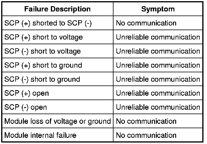 The SCP network uses an unshielded twisted pair cable of data (+) and data (-) circuits. The data (+) circuit is regulated to approximately 0.5 volt and the data (-) circuits to approximately 4.5 volts during neutral or rested network traffic. Voltage on data circuits increases/decreases as bus messages are sent. Multiple bus messages can be sent over the network SCP circuits allowing network modules to communicate with each other. The SCP network operates at a maximum data transfer speed of 41.6 Kbps and remains operational at a degraded level if one of the bus wires becomes open or shorted to ground or voltage.