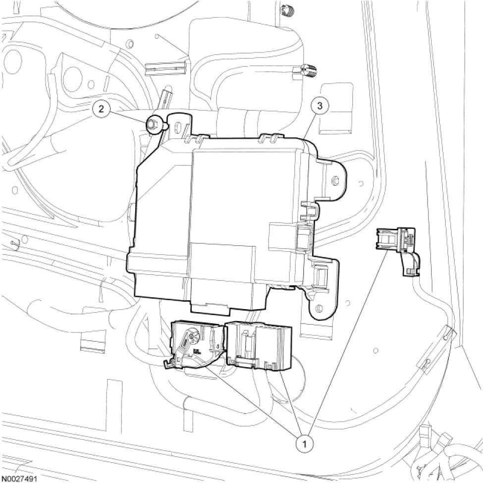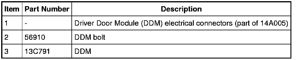 NOTE: Prior to the replacement of the Driver Door Module (DDM), it is necessary to upload the module configuration information to the Integrated Diagnostic System (IDS). This information must be downloaded into the new DDM after installation. For additional information, refer to Module Configuration Programming and Relearning.