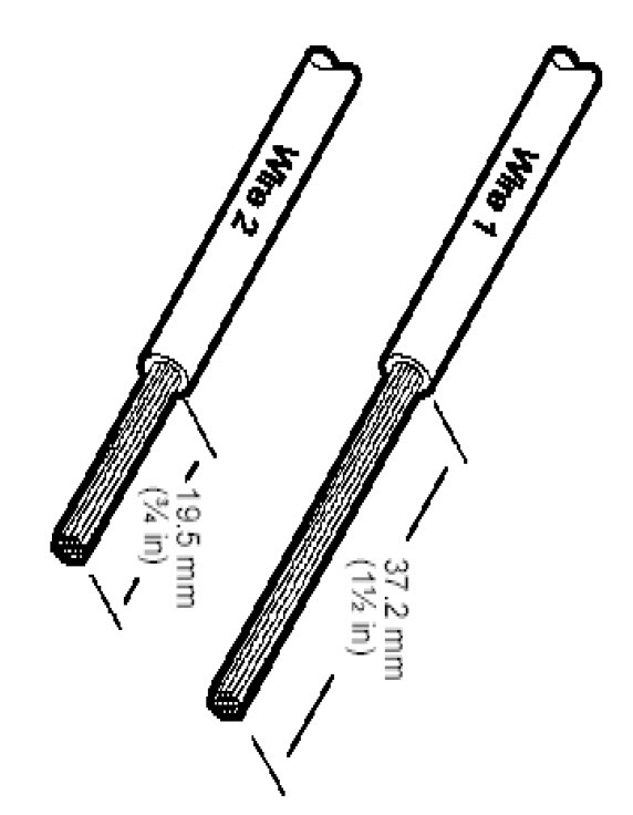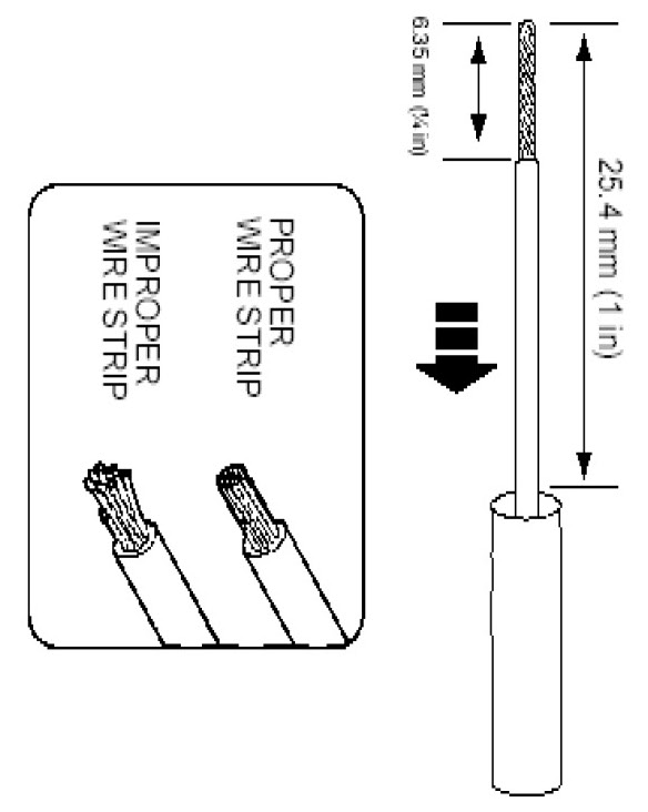 2. Strip 6.35mm (1/4 in) of insulation from each wire end, taking care not to nick or cut wire strands.