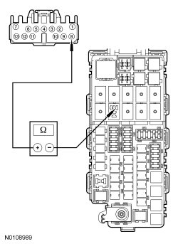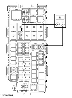 - Measure the resistance between the start diode, circuit CE336 (GN/WH), harness side and BJB (Battery Junction Box) starter relay pin 1, circuit CE336 (GN/WH), harness side.