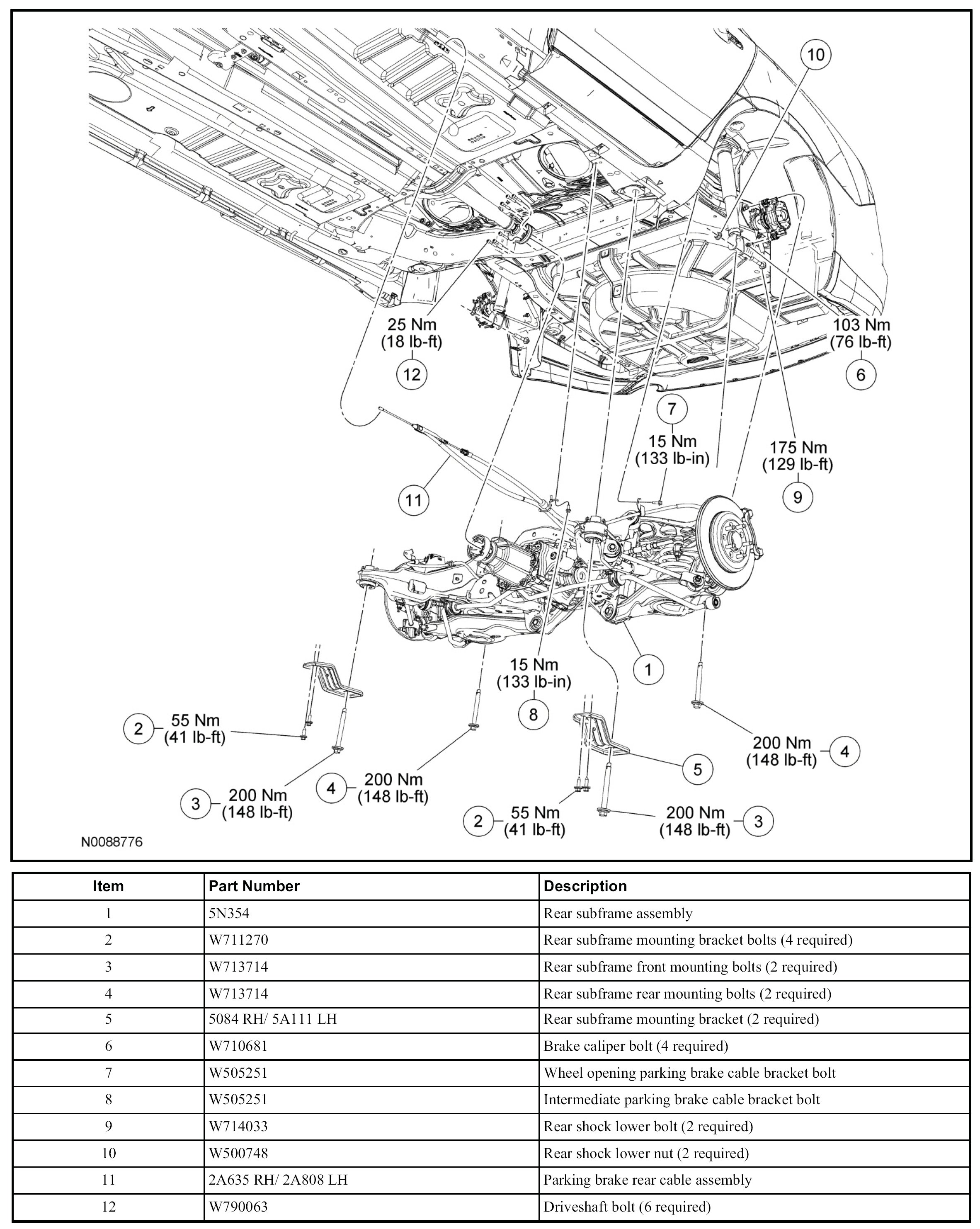 16. NOTICE: When positioning the lifting table, be sure to support the rear subframe on the subframe rails. Do not lift on the rear differential or rear control arms, damage may occur.