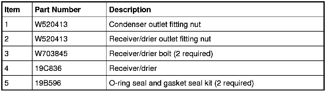 NOTE: Installation of a new receiver/drier is not required when repairing the A/C system, except when there is physical evidence of contamination from a failed A/C compressor or damage to the receiver/drier. Damage to the receiver/drier includes leaks in the receiver/drier, physical damage to the receiver/drier shell or desiccant, or moisture contamination. Moisture contamination results only from a complete loss of refrigerant and equalization of the refrigerant system pressure with atmospheric pressure for a period longer than one hour. If even a slight amount of positive refrigerant pressure is present in the system before repairs are carried out, the receiver/drier should not be replaced.