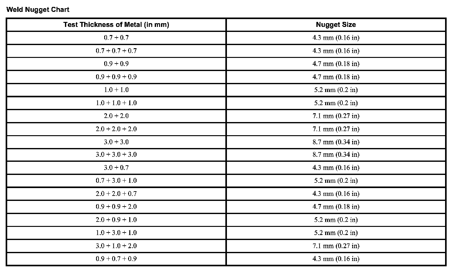 Weld Nugget Chart