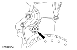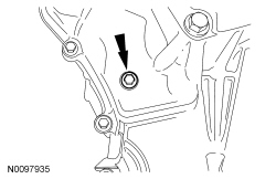 - Insert the M6 x 30 mm (1.18 in) bolt into the upper front cover timing hole to hold the tensioner arm in the retracted position.