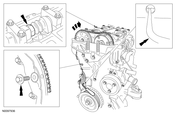 - Align the reference marks on the camshaft phaser and sprocket and the camshaft. Tighten the bolt to 72 Nm (53 lb-ft).