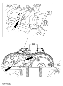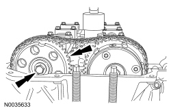 - Have an assistant rotate (using the flats of the camshaft) the exhaust camshaft clockwise to collapse the timing chain tensioner plunger.
