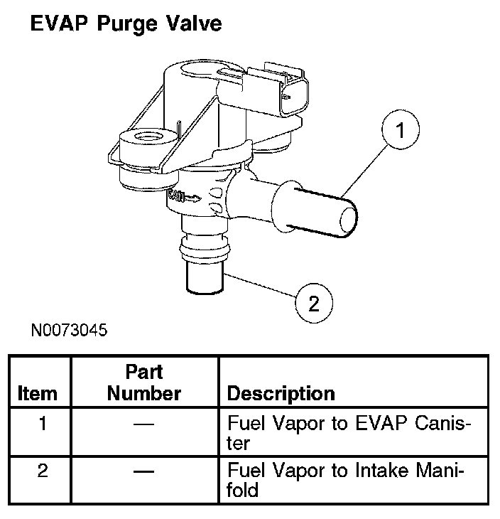 The EVAP purge valve is part of the enhanced EVAP system that is controlled by the PCM. This valve controls the flow of vapors (purging) from the EVAP canister to the intake manifold during various engine operating modes. The EVAP purge valve is a normally closed valve. The EVAP purge valve controls the flow of vapors electronically by way of a solenoid, eliminating the need for an electronic vacuum regulator and vacuum diaphragm. The PCM outputs a duty cycle between 0% and 100% to control the EVAP purge valve.