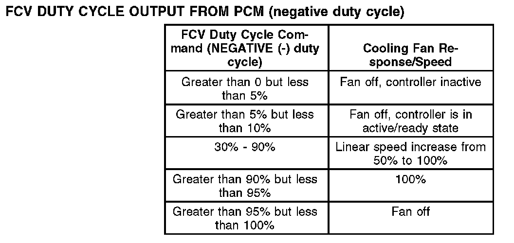 The PCM controls the fan speed and operation using a duty cycle output on the fan control variable (FCV) circuit. The fan controller (located at or integral to the engine cooling fan assembly) receives the FCV command and operates the cooling fan at the speed requested (by varying the power applied to the fan motor).