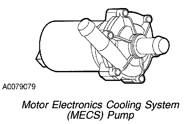 The motor electronics cooling system is required to maintain an acceptable temperature for the transaxle and the DC/DC converter. The system temperature is monitored by the motor electronics coolant temperature (MECT) sensor, which is an input to the PCM. The PCM commands the MECS pump using the MECS pump relay. The MECS pump is commanded on whenever the traction battery conductors are closed. The coolant in the system flows in a loop from the MECS pump, to the transaxle, then into the MECS radiator bottom hose port, out of the top hose port of the MECS radiator, into the DC/DC converter, and back into the MECS pump. The cooling system has a degassing system that is connected in parallel between the MECS radiator and the MECS pump. The degassing system bleeds air/gases into the degas reservoir.