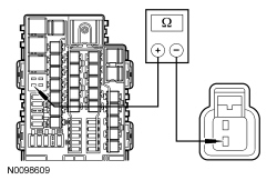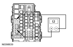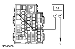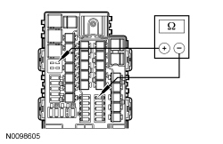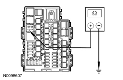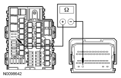 - Measure the resistance between BJB (Battery Junction Box) relay 44 pin 5 circuit CE621 (YE/GY), BJB (Battery Junction Box) side and ground.