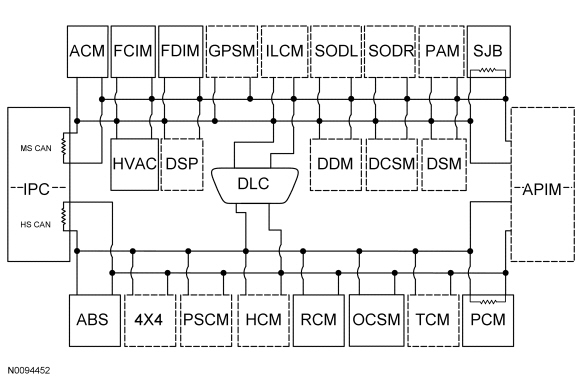 The IPC (Instrument Panel Cluster) is the gateway module, translating messages on the HS-CAN (High Speed Controller Area Network) to MS-CAN (Medium Speed Controller Area Network) and vice versa. This allows a message to be distributed throughout both networks. The IPC (Instrument Panel Cluster) is the only module on this vehicle that has this ability.
