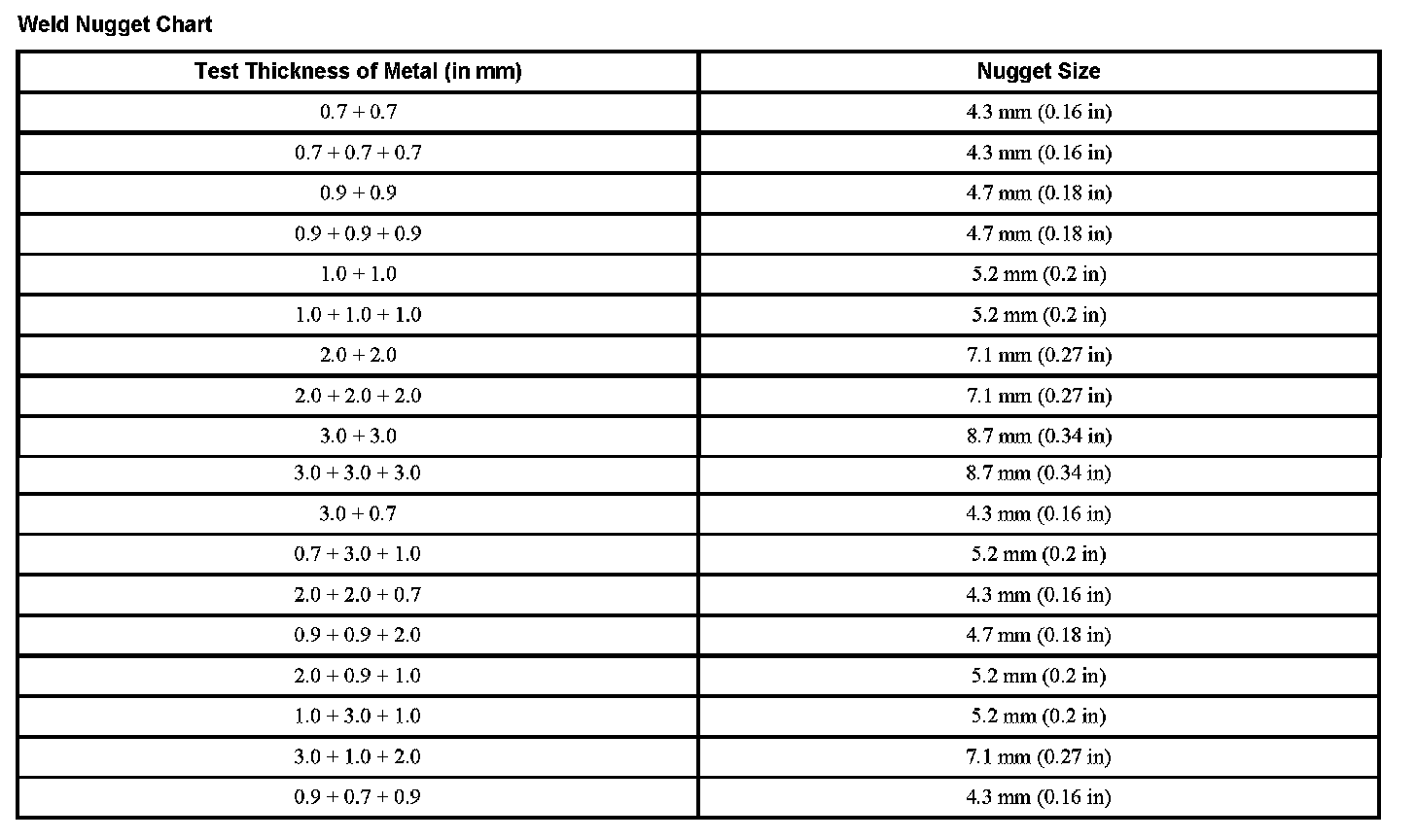 Weld Nugget Chart