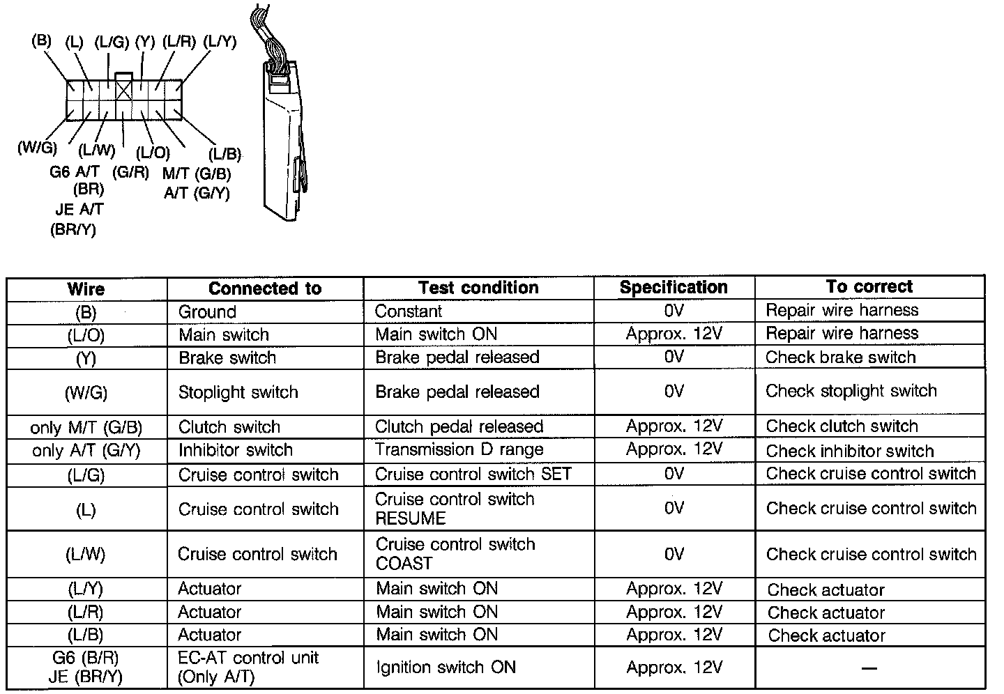 4. Measure voltage at following terminals of the control unit. If terminal voltage are correct, replace cruise control unit.
