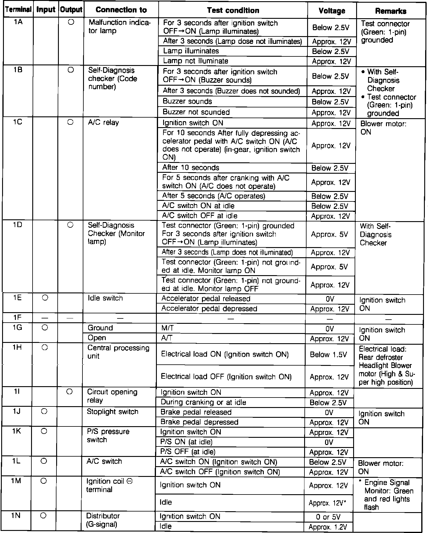 The Mazda Engine Signal Monitor (#49 9200 162) is utilized to check ECU terminal voltages. This tool inspects individual terminal voltages as selected with the monitor switch. A high impedance volt/ohm meter can also be used to check these voltages. Aftermarket test units are available that will read ECU terminal voltages when connected with proper adapters.
