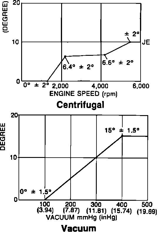 5. Attach a hand vacuum pump to distributor vacuum unit. Apply vacuum and note relationship between vacuum applied and degrees of advance. Compare to image chart.