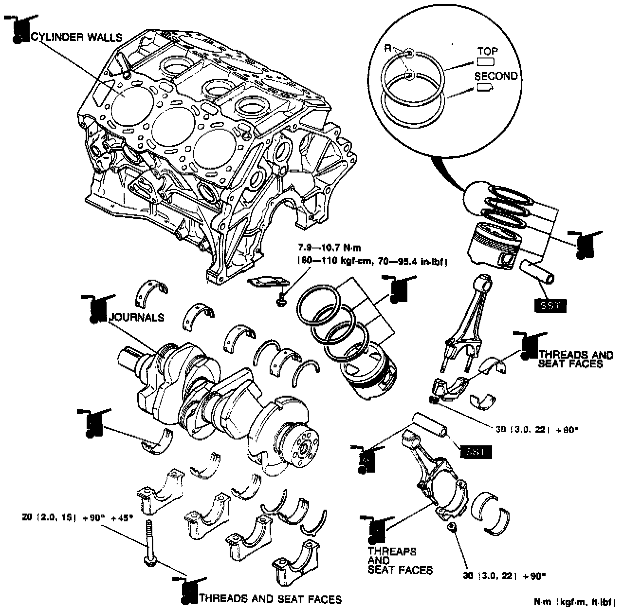 Apply engine oil to the threads and the seat face of each bolt.