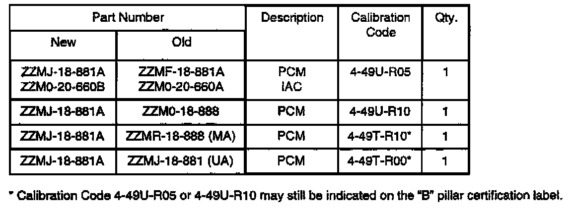 Verify that the Engineering P/N F4PF-12A650-MA or UA is on the PCM. Vehicles with these PCMs have an updated calibration of 449T-R10 or 4-49T-R00. Even if the vehicle has one of these calibration codes, it is still necessary to proceed to step 4.