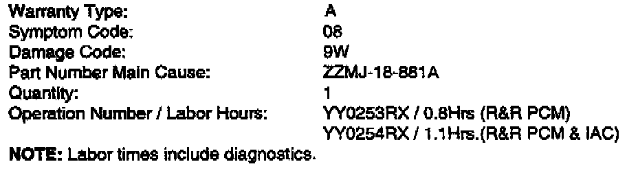 If the vehicle has a calibration code of 4-49U-R05 and the PCM does not have an Engineering P/N of F4PF-12A650-MA or F4P F-12A650-UA, the idle Air Control motor (IAC) must be replaced with a new level part.