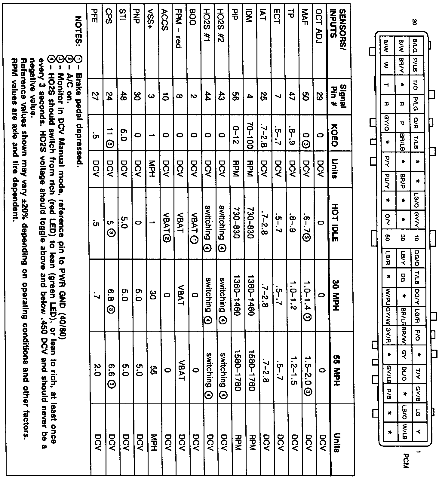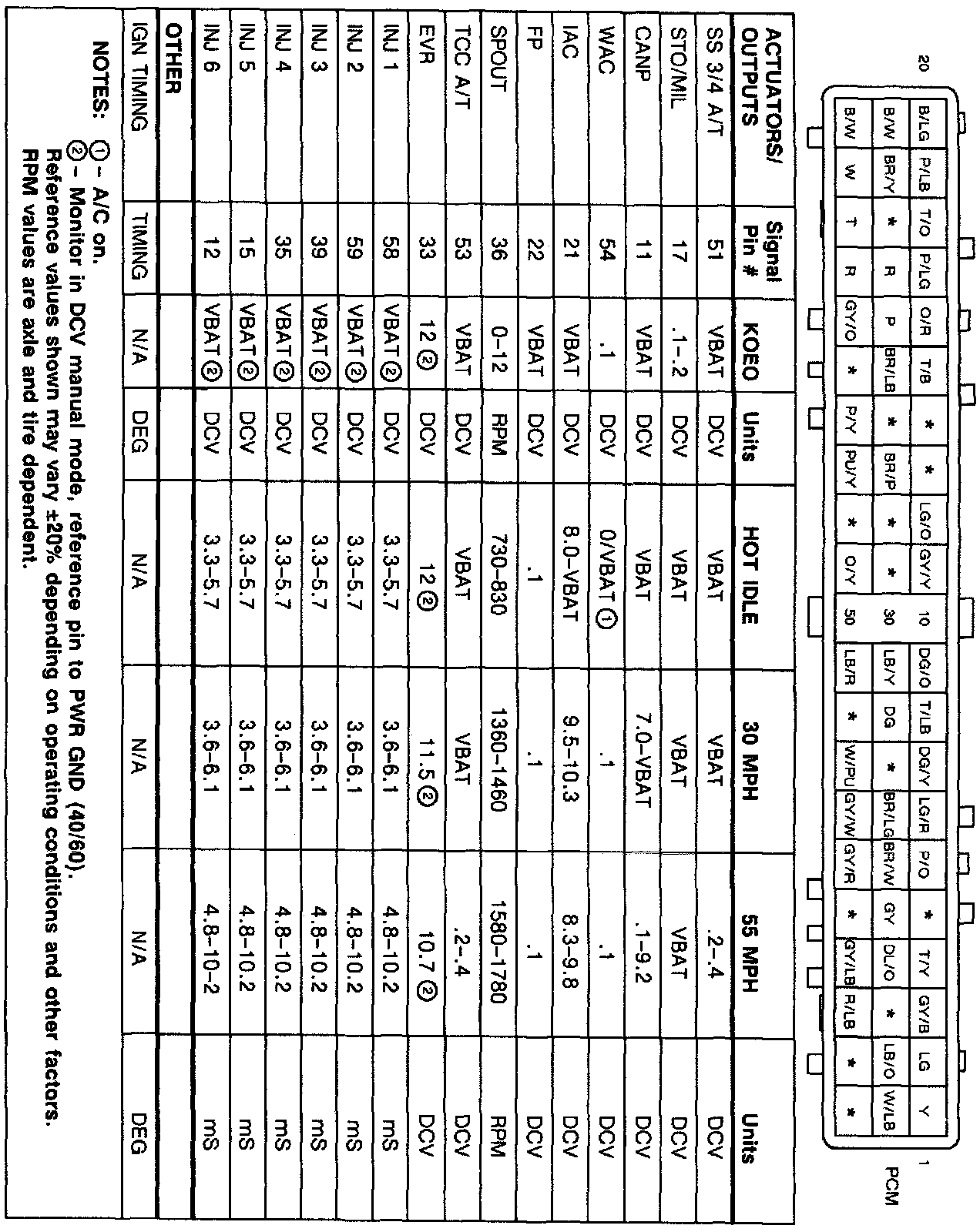 POWERTRAIN CONTROL MODULE TERMINAL (UNIT SIDE)NOTE: Reference values may vary 20% depending on operating conditions. RPM values are axle ratio and tire size dependant.