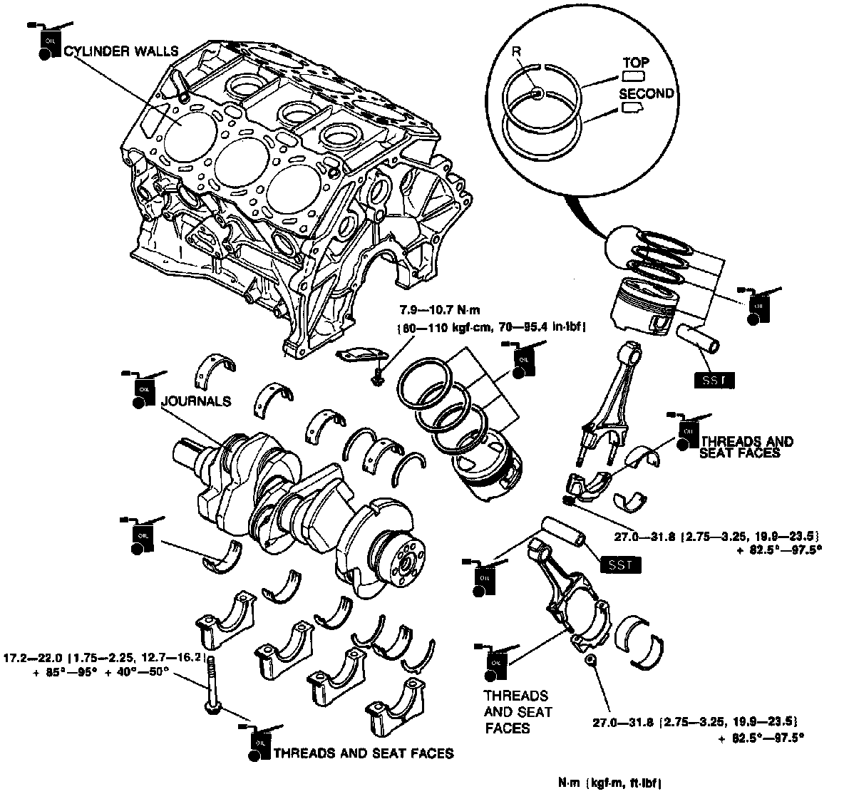 Apply engine oil to the threads and the seat face of each bolt.