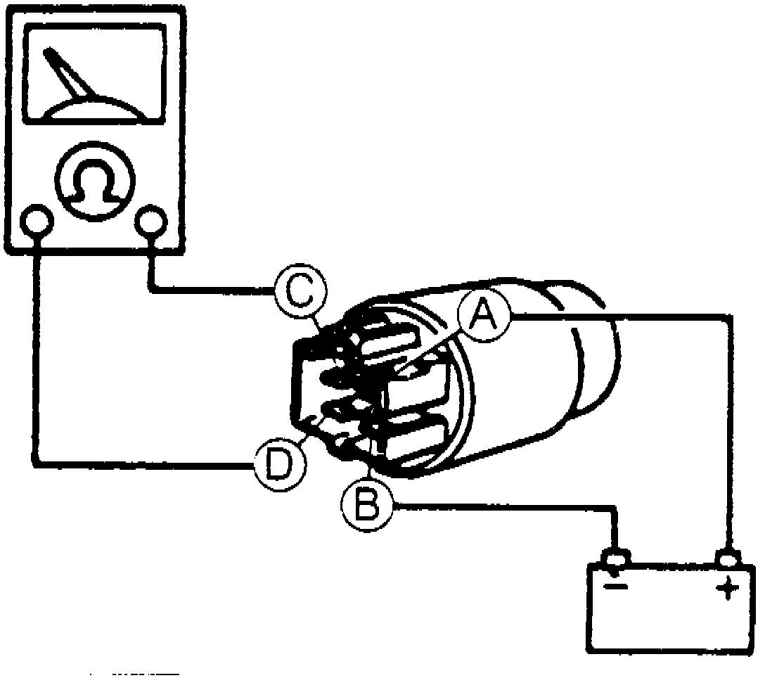 1. Ensure continuity does not exist between terminals C and D, Fig. 7. If it does, replace relay.2. Apply battery voltage to terminal A and ground terminal B. Continuity should now exist between terminals C and D. If not, replace relay.