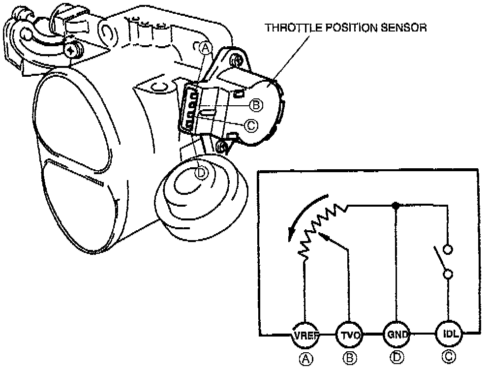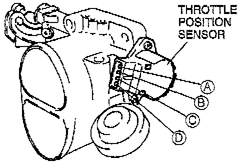 3. Check for continuity between throttle position sensor connector terminals (C) and (D) by using an ohmmeter.