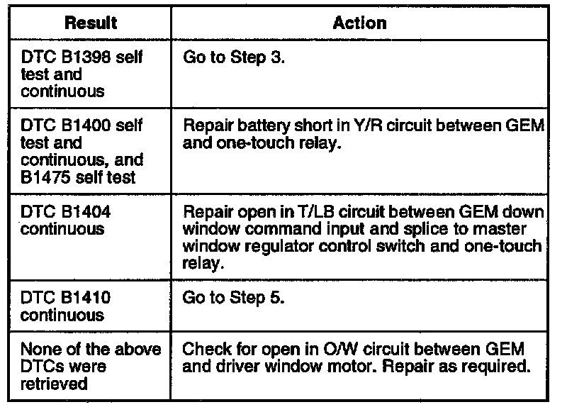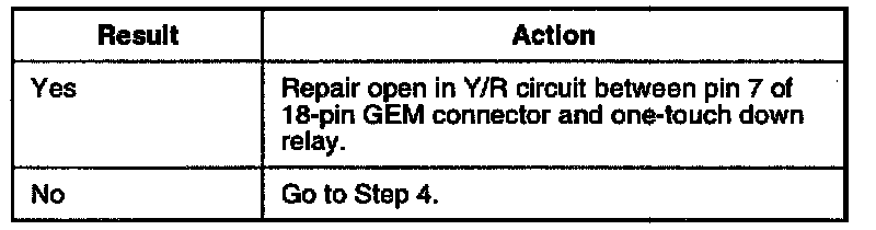 2. Check for open in GY circuit between pin 10 of 18-pin GEM connector and driver side window motor.