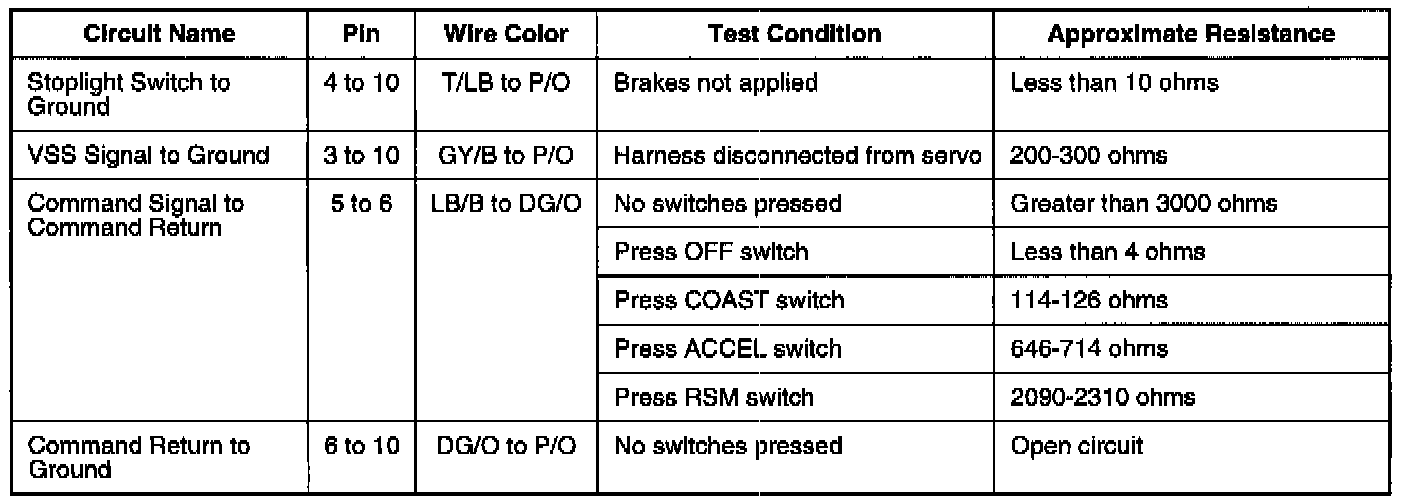 ^ Resistance Measurements: Remove harness connector at cruise control servo. Connect an ohmmeter between the designated circuits with the ignition switch off.