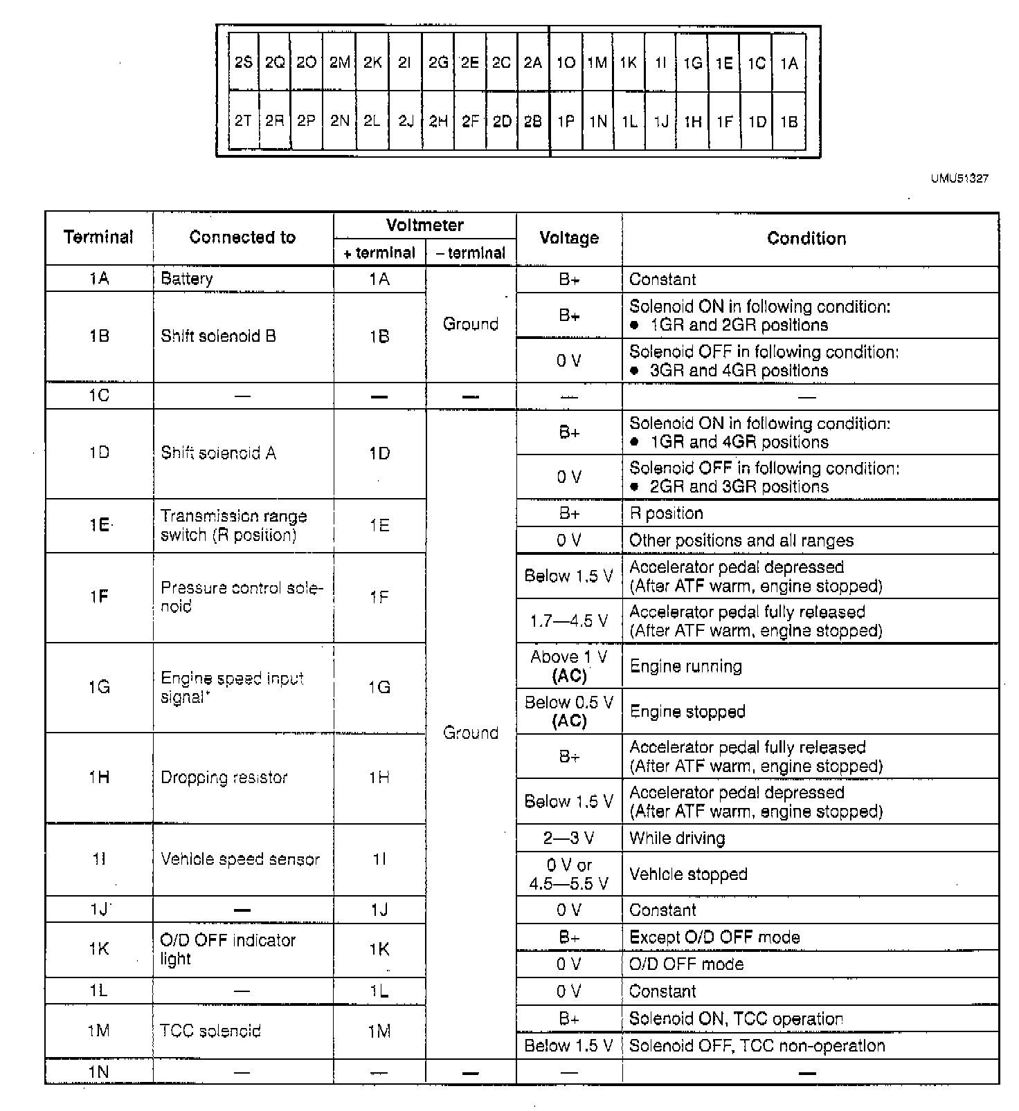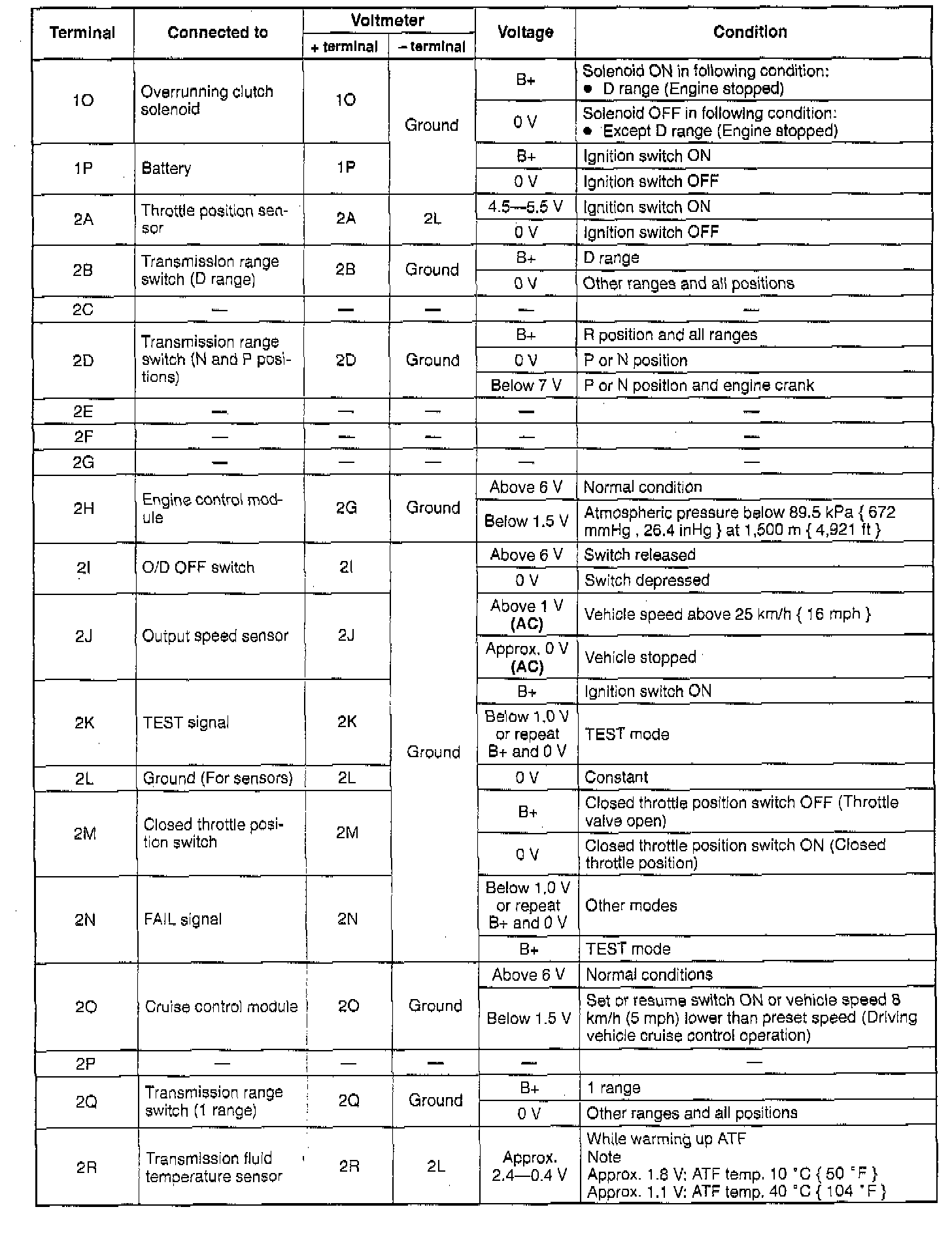 NOTE: Use the ground of terminal 1J of the transmission control module when measuring terminal voltage, as an error may occur when the negative (-) lead of the circuit tester is connected to ground.