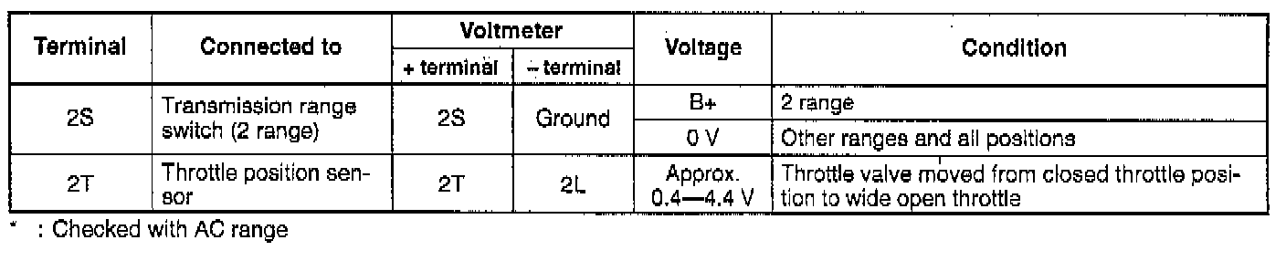 1. Turn the ignition switch to ON, and check the transmission control module terminal voltage, referring to the Terminal Voltage Chart illustrated.