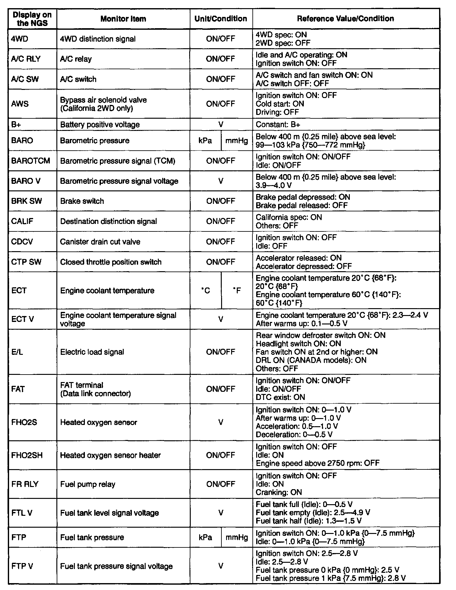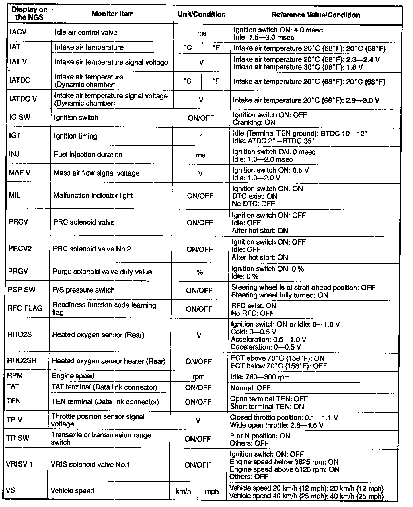 PID/DATA Monitor Table