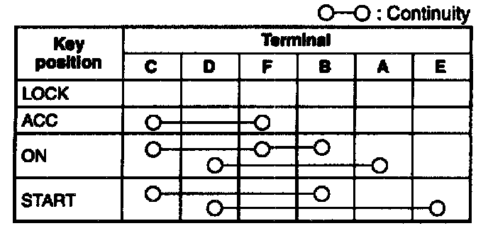 5. Check for continuity between the ignition switch terminals by using an ohmmeter.