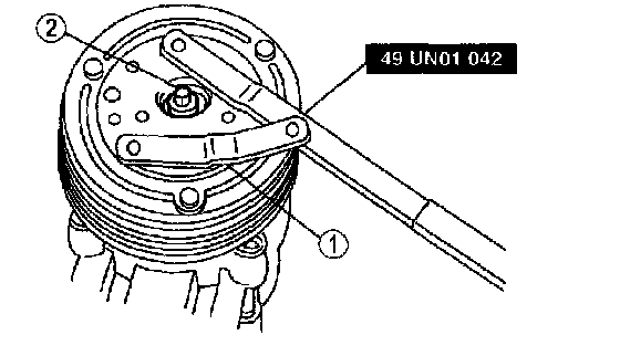 1. Hold the A/C clutch hub with the Spanner Wrench SST 49-UN01-042.