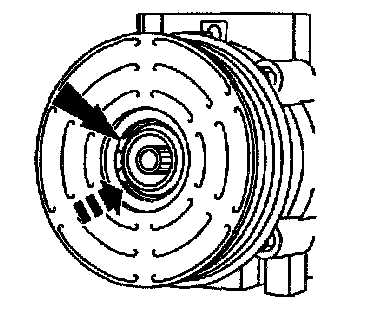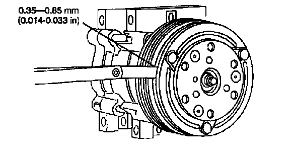 8. Measure and adjust the clutch air gap by removing or adding A/C clutch hub spacers; refer to MAGNETIC CLUTCH ADJUSTMENT.