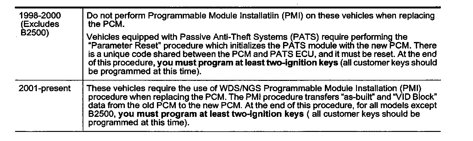 PCM replacement is done differently based on model year. Some vehicles require a Programmable Module Installation procedure (PMI). Other vehicles require "Parameter Reset" procedure. The table identifies which years each procedure applies to.