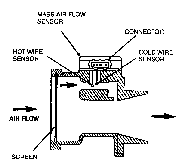 - Uses a hot wire sensing element to measure the amount of air entering the engine. Air passing over the hot wires causes it to cool. This hot air is maintained at 200° C (392° F) above ambient temperature as measured by a constant cold wire.
