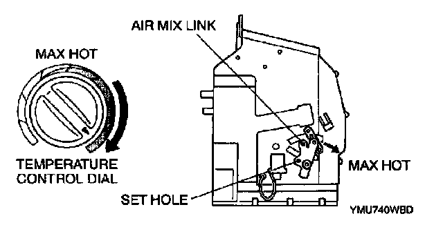 2. Set the air mix link to MAX HOT in the direction shown by the arrow and insert a screwdriver at the set hole.