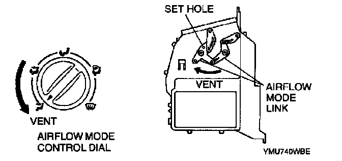 2. Set the airflow mode link to VENT in the direction shown by the arrow and insert a screwdriver at the set hole.