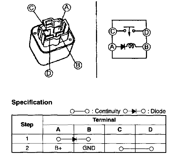 3. Inspect for continuity between main relay terminals using an ohmmeter.