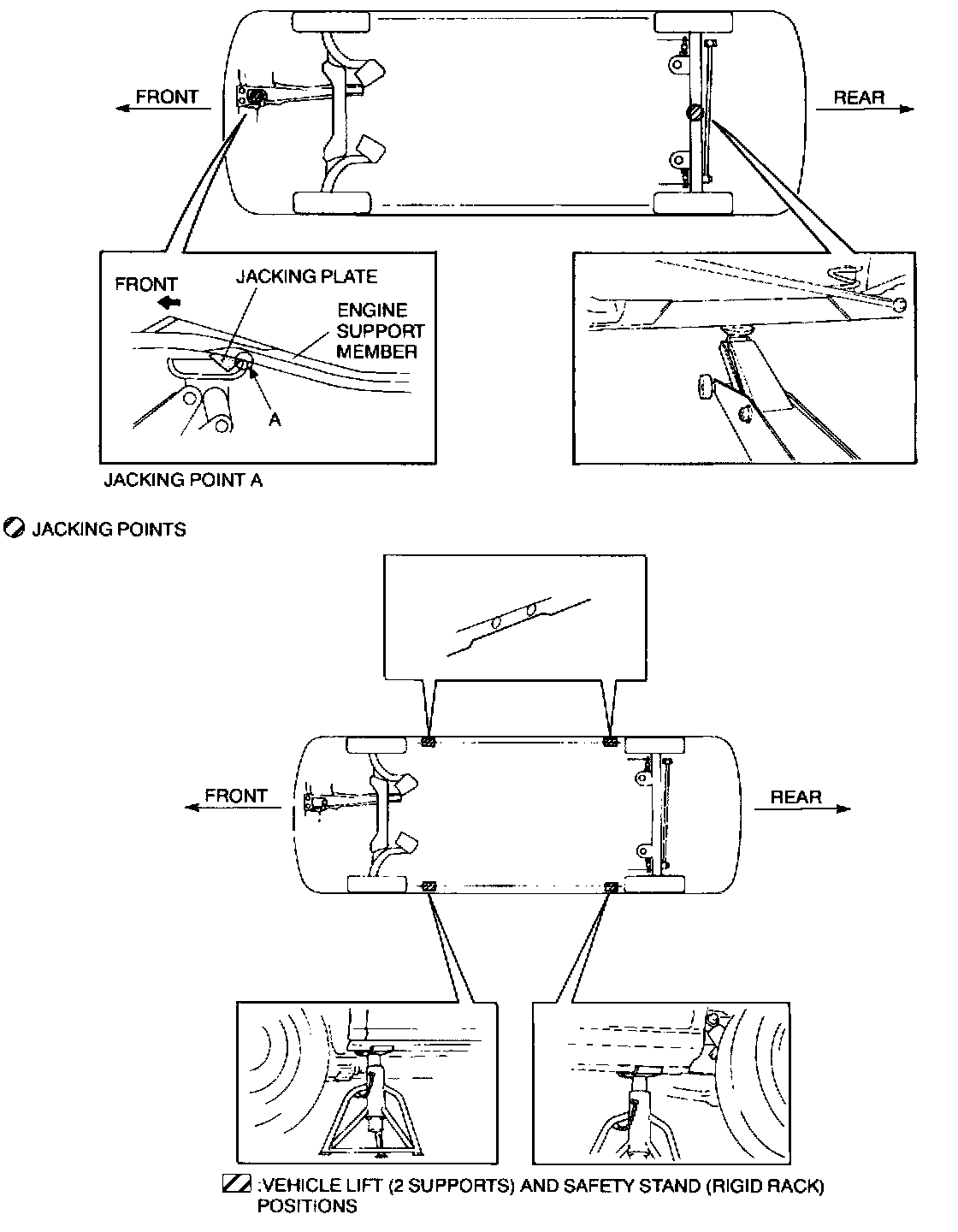 WARNING: Improperly jacking a vehicle Is dangerous. The vehicle can slip off the jack and cause serious Injury. Use only the correct front and rear jacking positions and block the wheels.Use safety stands to support the vehicle after it has been lifted.