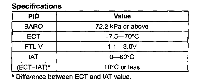17. Verify that FTP1SV PID are within the specification in the table according to the BARO and ECT PID values recorded in step 6.