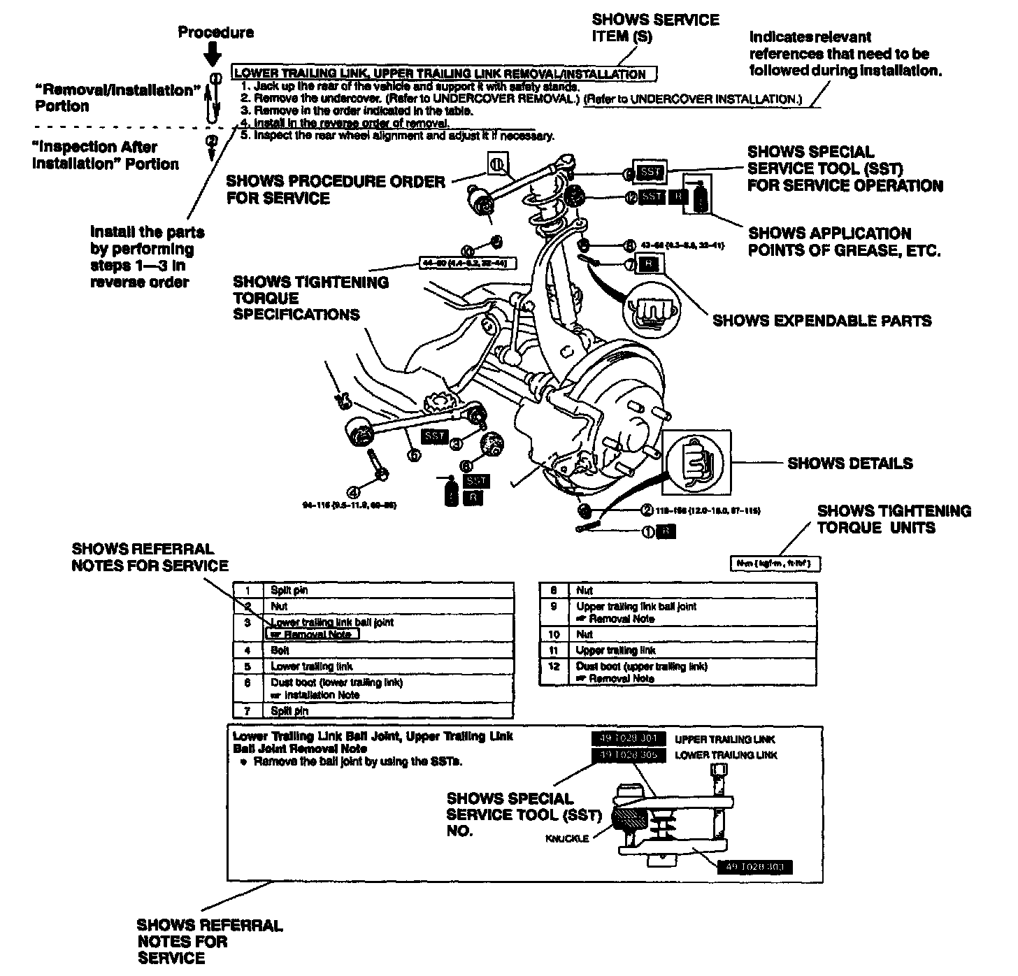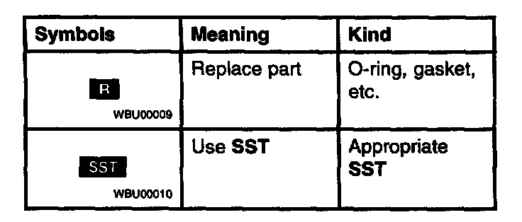 2. Expendable parts, tightening torques and symbols for oil, grease, and sealant are shown in the overview illustration. In addition, symbols indicating parts requiring the use of special service tools are also shown.