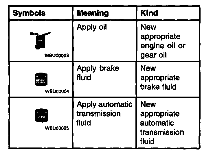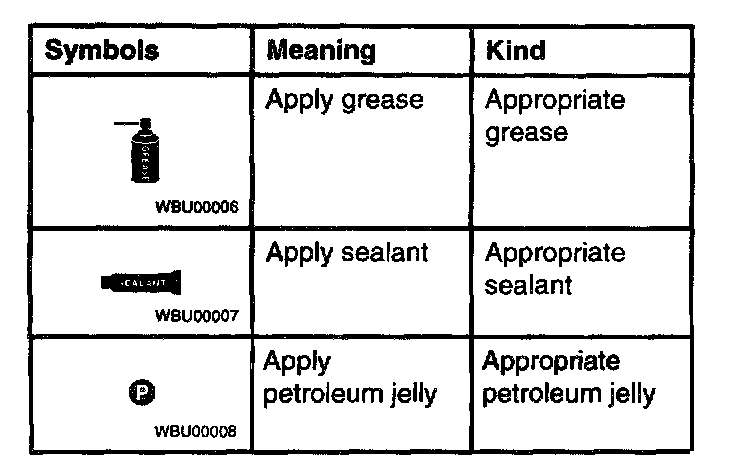 - There are eight symbols indicating oil, grease, fluids, sealant and SST use. These symbols show application points or use of these materials during service.