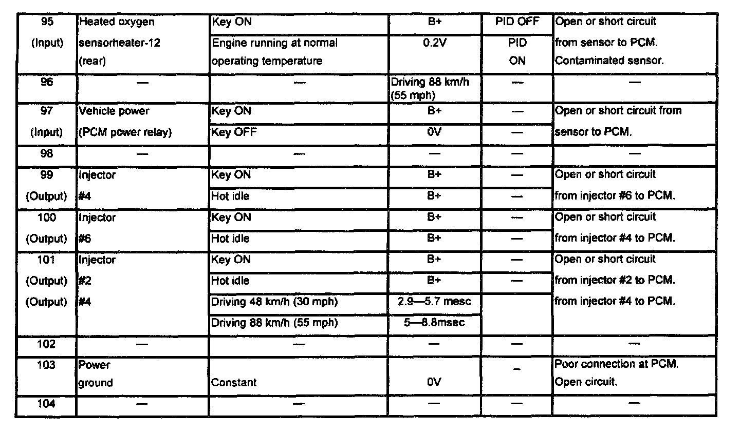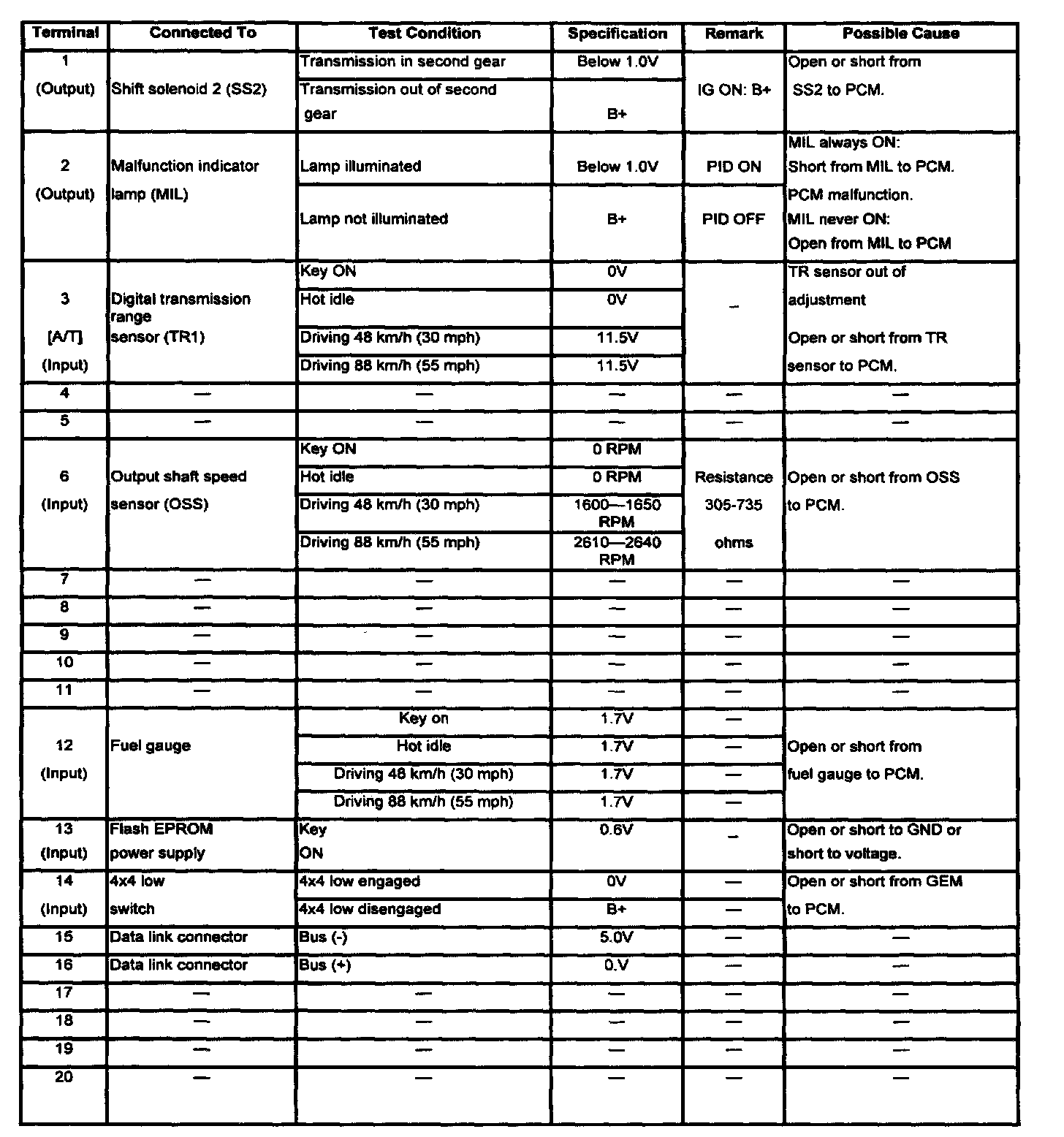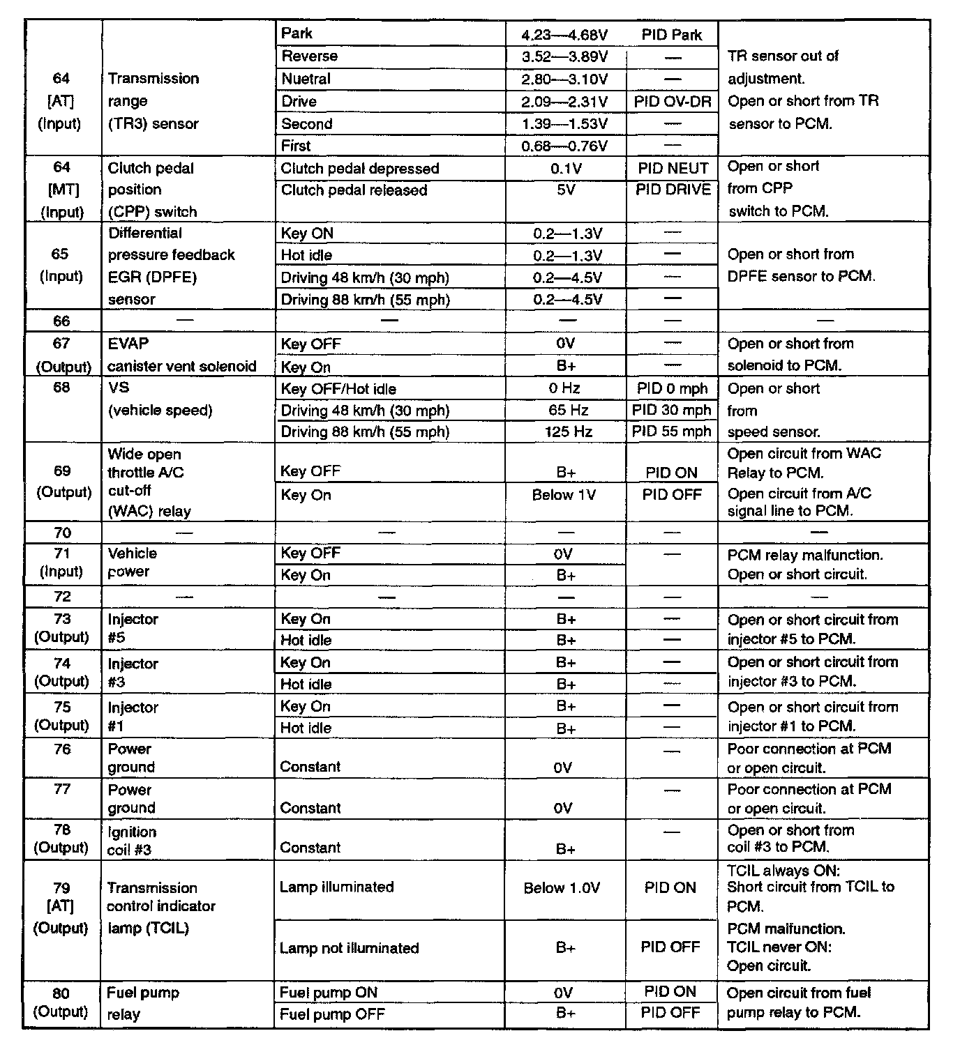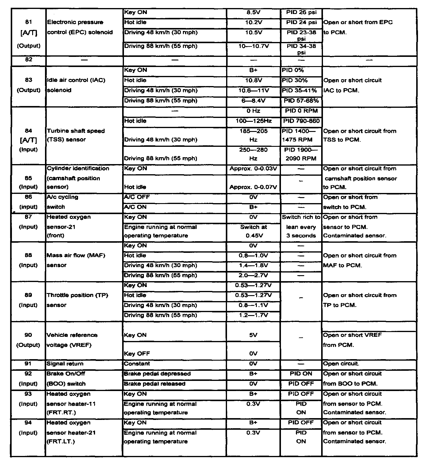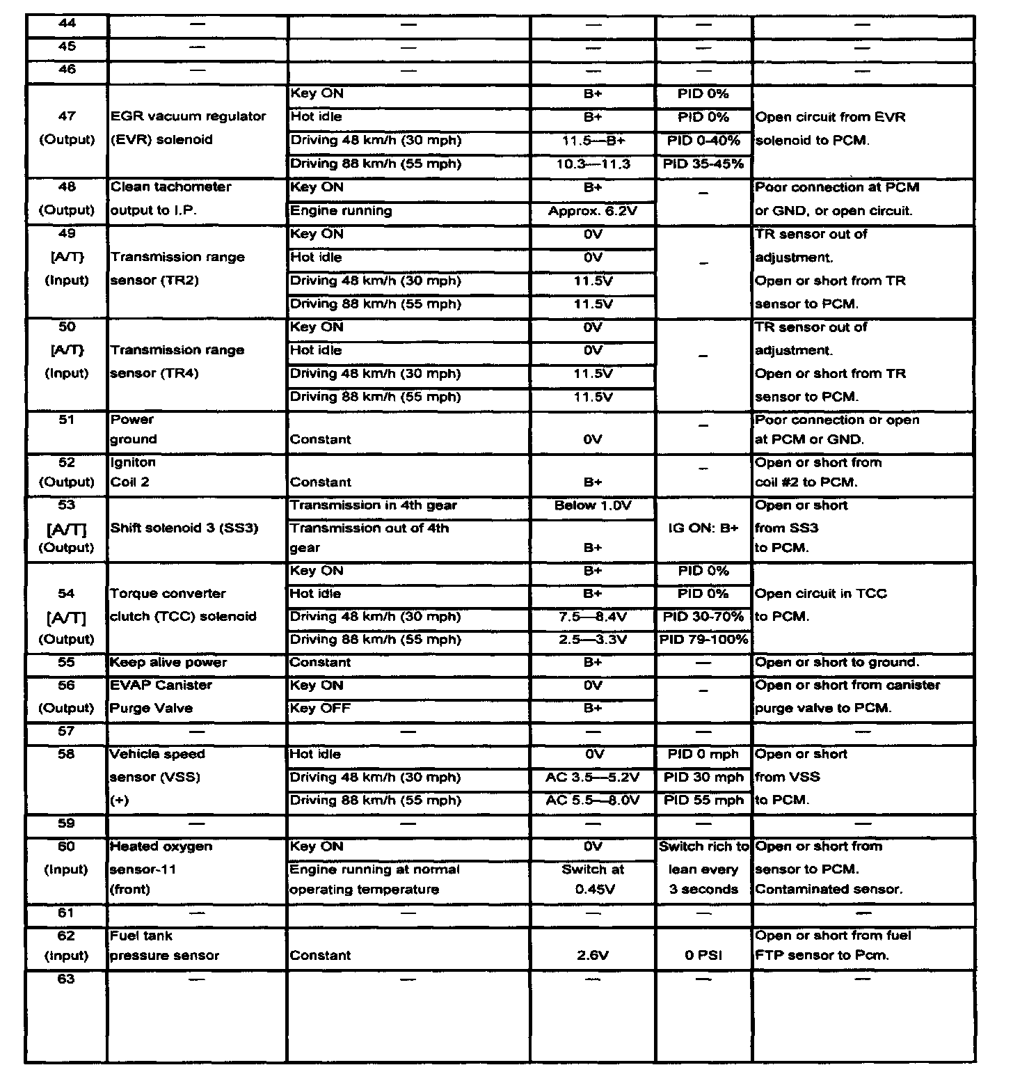 POWERTRAIN CONTROL MODULE (PCM) INSPECTIONCAUTION: The PCM terminal voltages vary with change in measuring conditions and vehicle conditions. Always carry out a total inspection of the input systems, output systems, and PCM to determine the cause of trouble. Otherwise, a wrong diagnosis will be made.