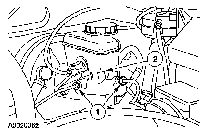 2. Inspect the (1) brake line nuts and the (2) brake master cylinder degas bottle for fluid leaks.