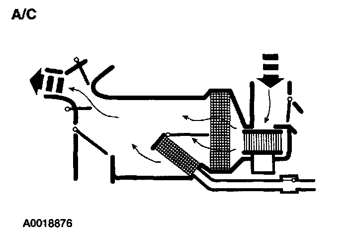 - The air inlet blend door, with no vacuum being applied, blocks recirculated air and allows outside air. Air flows through the system to the driver, passenger and center registers.