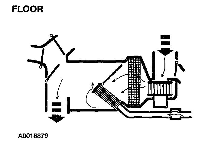 - The panel airflow door and the footwell airflow door are in the no vacuum position so that most of the incoming air is directed to the windshield defroster hose nozzle. There is also airflow to the side window demister and hose.