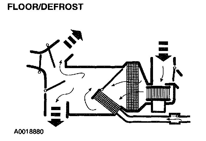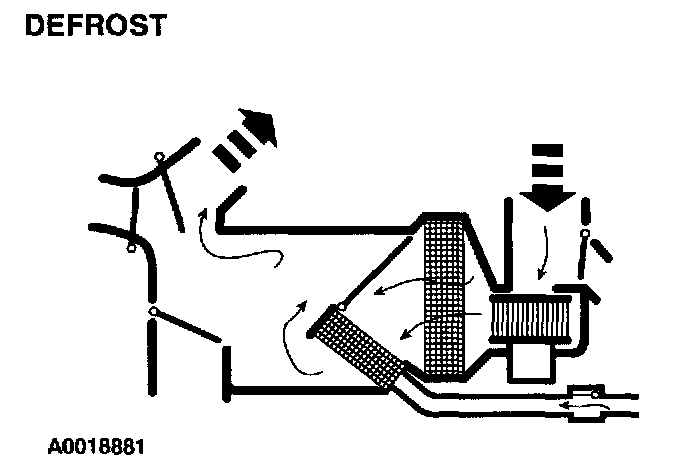 - The defrost airflow door is at full vacuum, closing off airflow to the windshield defroster hose nozzle and directing airflow to the heater outlet footwell duct.